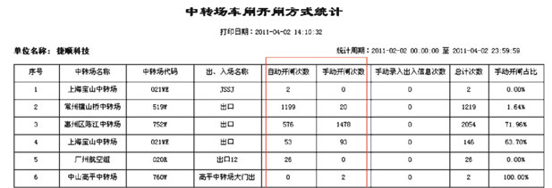 根据物流企业规模的大小,以及管理模式的不同,可分为单一站点的应用和集团化联网应用两种。其中单一站点管理,可分为终端设备层、园区管理中心两个层级;集团化联网应用,可分为终端设备层、单一站点管理中心、集团管理中心三个层级。 单点中转站应用 ![]() ![]() 方案特点 1、车辆管理 车辆分类管理,区分内部行政车辆、内部运输车辆、外部车辆等,并可对车辆类型进行分类管理; 外来车辆管理,系统提供外来车辆入场注册功能,可记录来访人、拜访人、访问事由,以及利用USB摄像头,抓拍证件、图像等信息,并一一绑定,方便后续追溯处理; 货车监控管理,采用车卡(卡座)、人卡分离,系统自由组合成 “车卡+人卡”的复合绑定模式,实现二次授权,管理什么人开启那一辆货车的权限,系统并自动统计什么人在什么时间开启了哪一辆货车。 ![]() 车牌自动识别系统 对于已登记车辆,通过车牌自动识别,比对车牌信息,可有效提高车辆的通行速度,及提高园区的安全性; 车辆黑名单管理:设置车辆黑名单库,能通过车牌信息对比,可及时发现各类黑名单车辆,并禁止其进入园区。 ![]() 2、信息发布系统 运营决策分析报表 系统除了提供传统一卡通系统的发行报表、车辆进出场报表、人事报表等以外,还针对物流企业运营管理特色,客制化定制了有利于物流企业充分掌握每个中转站的营运情况及有效杜绝人为舞弊的各式管理报表,为物流企业的科学化管理提供数据支撑,例如: 车流量统计、分析报表 ![]() 开闸方式统计报表 可按中转站名称,中转场代码,出、场名称时间等查询条件统计,系统自动记录系统自动(合法)开闸、手动开闸的次数,使 “人情闸”、“舞弊闸”等非法操作难逃系统“法眼”。 ![]() 车辆到站报表 ![]() 车辆到站延误报表 ![]() 远程WEB查询 系统支持局域网、广域网、互联网方式访问停车场数据管理中心,远程查看停车场经营状况。 ![]() LED信息发布 车牌号显示、车位情况等信息,可方便保安人员判别及车辆的调度。 3、人员管理系统 门禁系统 物流园区的入出口、行政办公楼、财务室、重点货物存放区等区域,安装门禁设备,包括门禁控制、刷卡记录查询、互锁功能等。 访客系统 物流园区内,人员入出比较复杂,为防止外来人员随意进出物流园区或进入重点区域,可通过访客管理系统,对外来人员进行登记,并记录来访人员的身份证、二代证等,进行临时授权,控制外来人员的进出、呆滞超时报警等。 访客登记示意图 ![]() 集团化管理应用 ![]() ![]() 方案特点 集团化联网应用,可分为终端设备层、单一站点管理中心、集团管理中心三个层级,通过固定IP的企业VPN专网,保证各分散网点实时通讯的稳定性,同时可做到实时监控全国各分散物流网点的运营情况,比如:每一点车辆入出中转站时间、预计到达下一站点时间、车辆营运时间、车辆营运延误时长等,并提供多种物流运营分析报表,为管理层提供决策分析依据。 例如: 车辆营运线时长报表 车辆延误报表 车辆运动轨迹跟踪报表 系统可根据车辆信息,检索统计每辆车辆、司机在整个物流链的时间轨迹,记录各个中转站的入场时间、出场时间、何时进入下一中转站等信息,以地理空间、时间维度的角度呈现车辆轨迹情况,实现“物流交接棒”的作用,方便总部及时了解车辆、人员的状态,以便实时的调度。 ![]() 车辆运动轨迹跟踪报表 ![]() 全国联网集中监控管理 ![]() 五、推荐产品 ![]() 双层停车场控制机